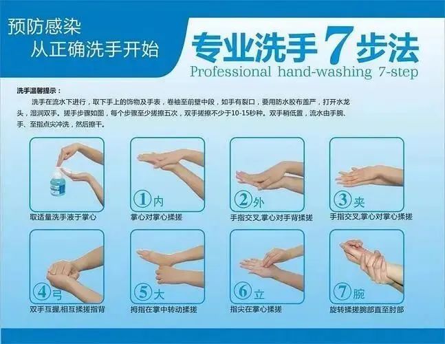 2.按照七步洗手法的顺序,使用肥皂或洗手液并使用流动水洗手;